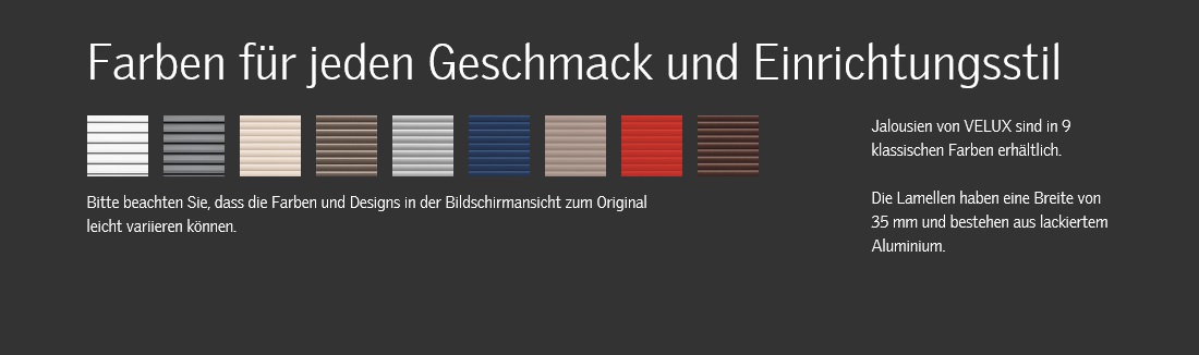Mit ihrer Kombination aus klassischer Eleganz und Einfachheit lassen VELUX Jalousien die richtige Menge Licht in den Raum und bewahren gleichzeitig die Privatsphäre. Durchdachte Bedienung und modernes Design runden den Klassiker ab.